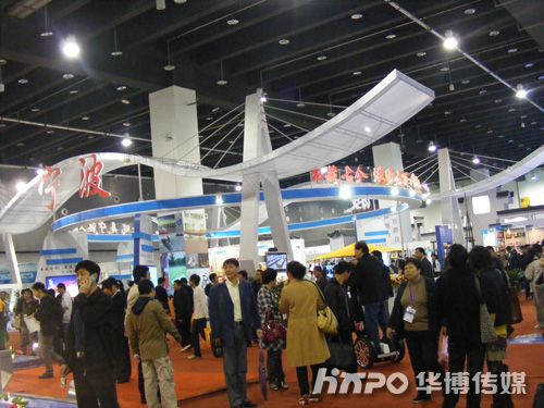 宁波展台位于义乌国际博览中心B1馆,总面积450平方米,华拓装饰工程公司在展台设计策划上以蓝色海洋为基调,区别其他展厅设计方正、封闭的造型,以宁波标志建筑“全桥”的一部分为基本造型,突出宁波的整体形象,让参展观众对宁波这个繁荣的城市印象深刻。展会期间,宁波市江东、江北、海曙、鄞州、宁海、象山、北仑、镇海、奉化等个县、区共组织55家企业参展,现场展况火爆,引起客商高度关注。