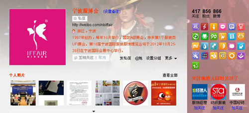 (通讯员 陈辛茹)宁波服博会自开通新浪微博以来,受到业内外各界的广泛关注,截止发稿,官方微博“宁波服博会”(http://weibo.com/nbiffair)粉丝已达856位,创下历史新高。第十六届宁波服博会将于10月25日-28日举行,欢迎广大网友通过评论或@等方式参与到服博会中来,同时,组委会也将及时发布展会最新动态与大家分享。