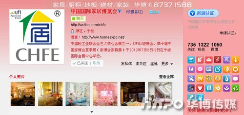 (通讯员 陈辛茹)第十届中国家博会夏季展已于日前圆满落幕,展会期间家博会官方微博广受各界关注。家博会组委会利用微博平台及时发布展会亮点及最新动态,形成了展商、媒体、观展群众等热烈的网络参展、观展氛围,转发、评论络绎不绝。截止发稿,家博会官方微博——中国国际家居博览会(http://weibo.com/chfe)粉丝人数已达1322位。