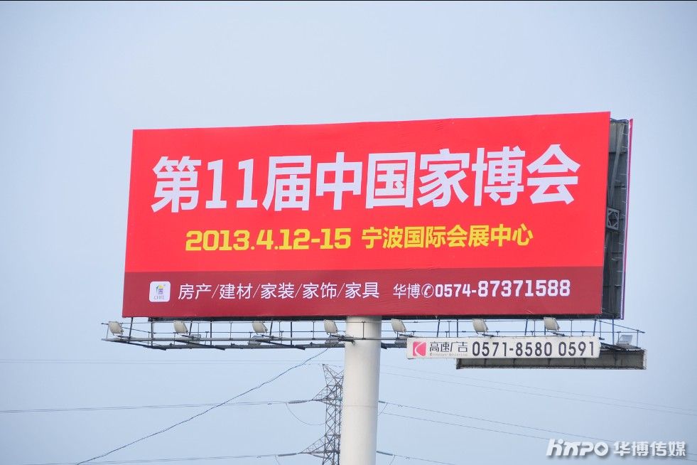 位于宁波杭甬高速段塘出口处的家博会高炮广告欢迎来自各地的客商前来宁波参展参观四月家博会。