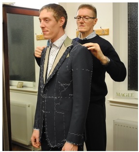 大师们根据中国客户的体型,带来了没有完工、里衬可见的套码样衣,一方面可以显示英式做工水准,另一方面可以让客户直接感受英式西服的款式和魅力。在测量完成后,大师会找出与客户身材相近的样衣让客户穿上,然后进行立体修正。如客户肩膀一高一低需要垫高,腰身的调整,袖笼大小是否合适等,用针一一固定,并记录在标有版式解构的图纸上。大师特别要求,一定要上下前后活动胳膊和肩部,以确保穿着后活动自如。