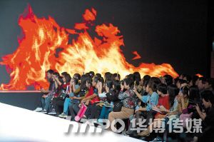刚好,我拍的时候,正要展示“中国红”系列,观众周围的屏幕上“燃烧”起熊熊火焰,全场人仿佛置身火海,大家都期待地望着T台。