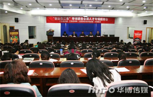 杨杰董事长在招聘会上谈到会展业和公司情况时,用“前景无限的产业”,“充满激情的团队”,“潜力巨大的项目”,“科学创新的管理”,“先进和谐的文化”五句话作了概括。他表示,会展业是一个前景无限的产业,有志于投身其中的青年学子应该具备全面的综合素质,良好的意志品格,并在工作中不断学习,努力进步,创造自身的价值。对于华博公司,杨总说,这是一个优秀的会展企业,拥有一流的管理,一流的企业文化和一流的合作团队,在全体员工的共同努力下,公司已在短短几年内实现了跨越式发展。