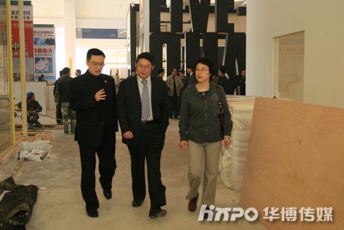 华博会展董事长杨杰(左一)向张秘书长(左二)和房敏主任(左三)介绍布展情况