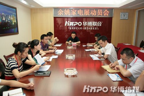 (通讯员 综合部刘凡)2009年7月24日上午,华博联合召开了第三届中国宁波家用电器博览会余姚家电展(简称“余姚家电展”)动员大会,公司董事长杨杰出席并作重要讲话,招展、招商、宣传等相关部门人员参加。