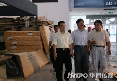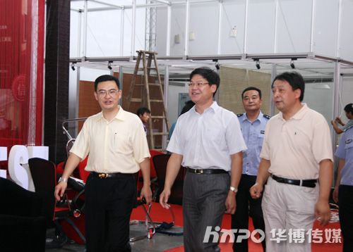 江东区副区长周少华(中)在杨总(左)陪同下视察夏季展布展