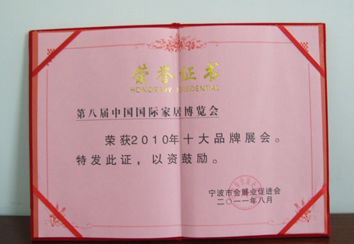 (通讯员 寿雯静)第八届中国国际家居博览会荣获2010年十大品牌展会,图为宁波市会展业促进会颁发的奖牌和荣誉证书