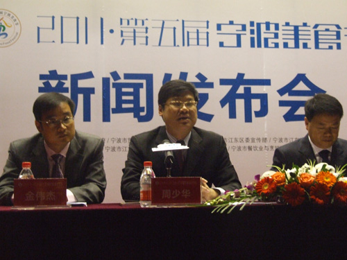 (通讯员 寿雯静)2011年10月31日上午9:30,2011·第五届宁波美食节新闻发布会暨《品味·美味·韵味》主题手册首发式在世纪东方广场海上国际影城召开,宁波市江东区府副区长周少华作新闻发布并回答记者提问,江东区委宣传部副部长余清水主持发布会,江东区商务局局长金伟杰、宁波市书画院副院长林邦德回答了记者提问。都市快报、宁波日报、宁波晚报、东南商报、现代金报、宁波电视台、宁波人民广播电台、中国宁波网等各大媒体记者参加了发布会。