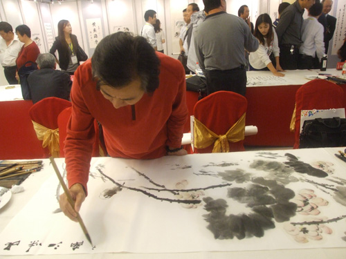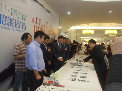 今年的宁波美食节凸显了浓浓的文化氛围。昨天上午,宁波书画名家美食主题现场笔会暨书画作品展在世纪东方广场二楼开展,20位书画名家现场挥毫泼墨,展示美食文化的魅力。