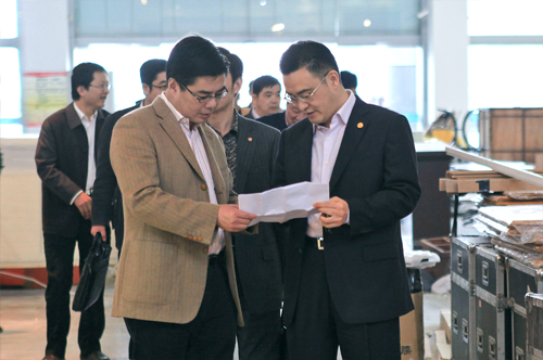宁波市江东区副区长邵方毅检查布展现场(左)华博董事长杨杰陪同检查(右)