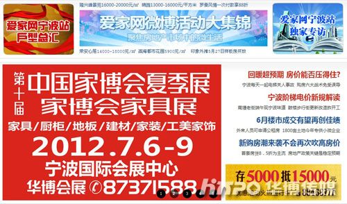 (通讯员 陈辛茹)继中国宁波网装修频道首页家博会形象宣传广告上线,近日,新浪网、搜房网、搜狐网、爱家网及和家网等网站首页家博会广告也相继上线,届时,组委会将及时对各媒体发布最新展会资讯,欢迎广大网友关注参与。