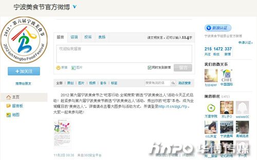 (通讯员 陈辛茹)第六届宁波美食节已于日前完美谢幕,宁波美食节新浪官方微博(昵称:宁波美食节官方微博 http://weibo.com/nbmeishijie)作为美食节活动宣传互动的重要窗口受到广大美食爱好者的广泛关注。截止发稿已拥有1472名粉丝,感谢各位网友的关注和支持,宁波美食节官方微博仍然会不间断地为大家发布各种美食资讯,2013年宁波美食节,我们明年再见。