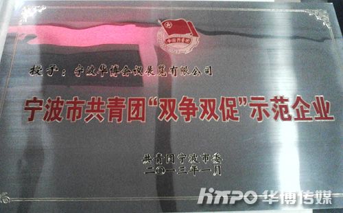 (通讯员 徐佳)日前,宁波华博会议展览有限公司被共青团宁波市委授予“宁波市共青团‘双争双促’示范企业”荣誉称号。