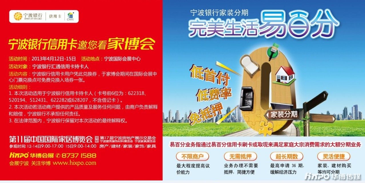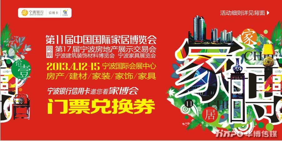 (通讯员 郁俏峰)家博会组委会为更好地服务宁波市民,再次携手宁波银行共推“宁波银行邀您看家博”活动。在第11届中国国际家居博览会期间,宁波银行汇通信用卡持卡人可凭随账单寄送的兑换券和宁波银行信用卡,在会场售票处兑换门票一张。据悉,赠送的兑换券券数量近30万张。