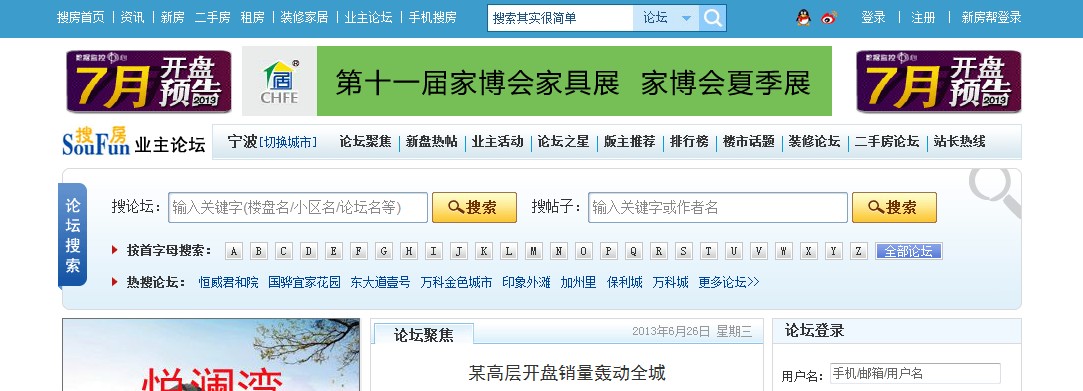(通讯员 郁俏峰)宁波搜房网首页推出家博会夏季展广告,同时在搜房网业主论坛置顶家博会夏季展广告。