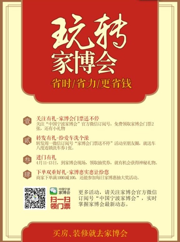 (通讯员 邵丽琼)家博会华丽推出好礼四重奏——1、关注官方微信有礼,2、转发活动至朋友圈有礼,3、到现场有好礼,4、下单更有双重大礼!送礼活动海报今日已惊喜亮相宁波天一广场,引发众人关注。