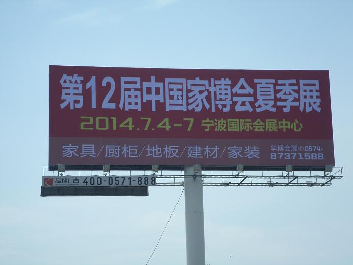 (通讯员 邵丽琼)第十二届中国国际家居博览会将于2014年7月4日至7日在宁波国际会展中心举行,日前,其形象宣传广告已在杭甬高速段塘段投放。