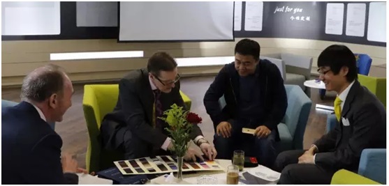 一些客户来到定制中心会急于量身,但英国定制大师首先会坚持请客户先坐下来,询问他们做这套西服主要在什么场合穿着,有什么特别需求或喜好等,然后根据客户的体型和肤色与发色,给出色彩和款式的建议。款式,包括正装和休闲装等,从驳头的形状、单双排扣、单双开叉、是否收腰以及口袋的直或斜、票袋是否需要、裤子前后口袋的样式等等,有很多选择,大师会一一和客户讨论,然后确定。面料的选择也很复杂,根据客户的体型、生活方式和肤色,大师提出建议,与客户一起从上千种面料中选择服装面料的克数、颜色以及从里布到衬布,从角质或母贝纽扣到搭配手工扣眼的丝线,一一确定。