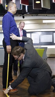 下体测量是在穿着套码样衣并进行修正后进行的,这时的测量可以保证裤子的长度比较合适。当然,在测量时,大师会问客户习惯的裤腰的位置,进行高低的调整,是否系皮带等细节也被问到,因为西裤中的腰长有一种是可以不系皮带进行调整的。中国男士好像已经习惯于系皮带,所以大多需要蚂蟥袢。