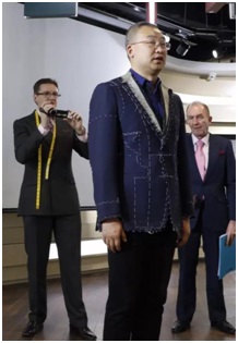 大师们根据中国客户的体型,带来了没有完工、里衬可见的套码样衣,一方面可以显示英式做工水准,另一方面可以让客户直接感受英式西服的款式和魅力。在测量完成后,大师会找出与客户身材相近的样衣让客户穿上,然后进行立体修正。如客户肩膀一高一低需要垫高,腰身的调整,袖笼大小是否合适等,用针一一固定,并记录在标有版式解构的图纸上。大师特别要求,一定要上下前后活动胳膊和肩部,以确保穿着后活动自如。